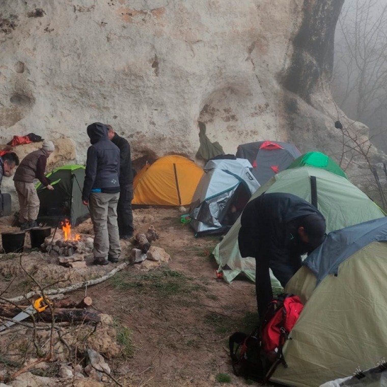 Переход был очень сложный. Погода совсем испортилась – шёл моросящий дождь, временами срывался ливень. Сегодня переход проходил через посёлок Терновка, где мы закупили продукты на следующие два дня. Рюкзаки потяжелели, а впереди крутой подъём на скалу. Поднимались к месту ночёвки в пещере недалеко от Шулданского монастыря. Под ногами скользкие камни, грязь и мокрые листья. Благодаря палкам и усилию воли, из последних сил прошли этот переход и разбили лагерь. Отдых и ужин. Макароны с сыром и салат из свежих овощей показались величайшим наслаждением.