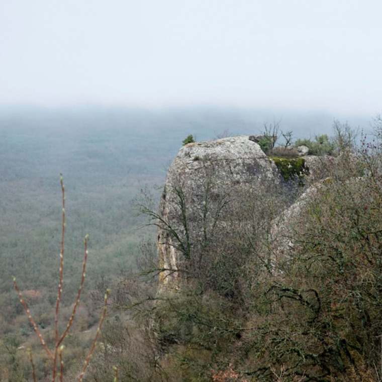 В скалах ночь прошла спокойно, был дождь, но мы переночевали в сухости, никто не промок. Утро, густой молочно-белый туман. После вкуснейшего завтрака – ячневая каша с семенами (тыквенные и подсолнечные семена, кунжут) и ароматного чёрного чая с травами – налегке отправились в пещерный город Эски-Кермен. Спускались к нему со скал, проходили через живописнейшие места в горах, нехоженными тропками, мимо ущелий и гротов, пропастей и обрывов, через леса и рощи. На подходе к городу молочный туман начал рассеиваться.