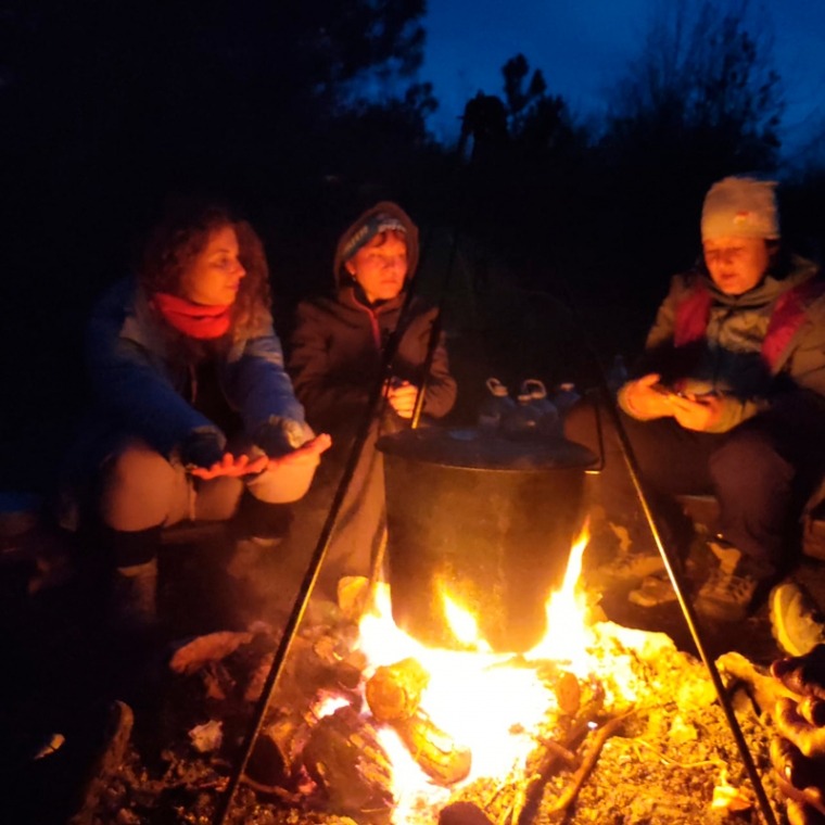 Дошли до обрыва плато, вдали из-за облаков показалось солнце. На краю обрыва совершили мантру любви, нежности и радости. В лагерь спускались в сумерках. У костра нас ждал вкуснейший гороховый суп и ароматный имбирный чай с печеньем, игры в слова.