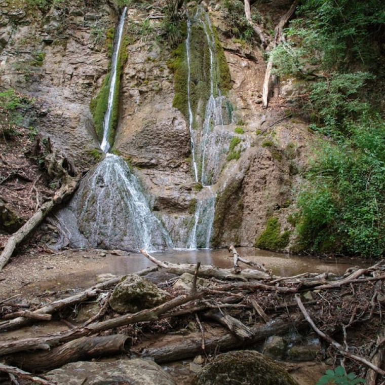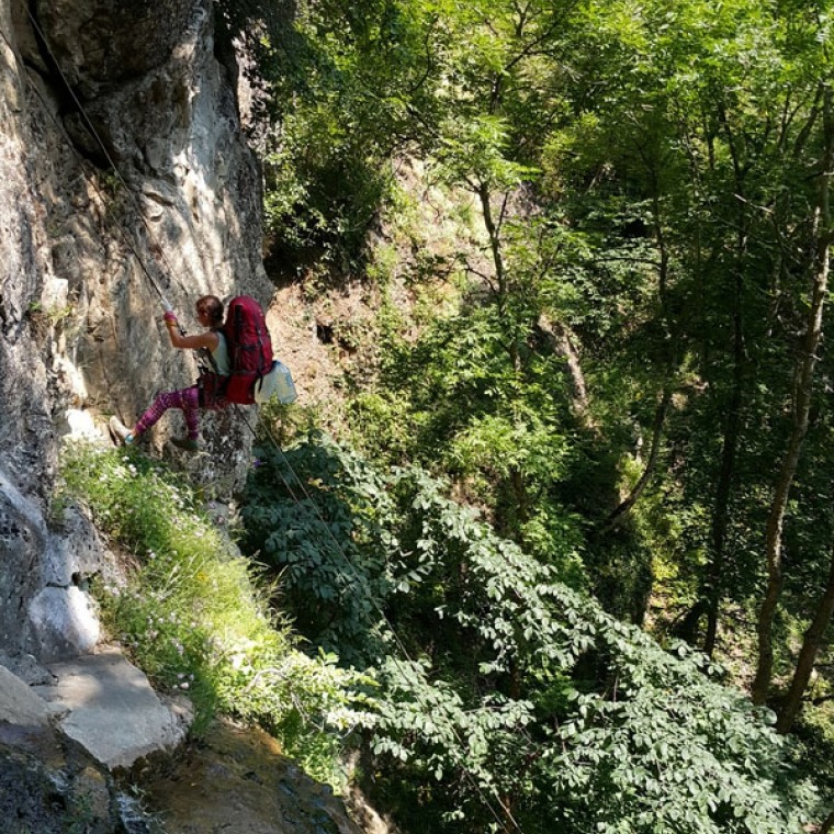 И дюльфер по Сотере. Замечателен. Лишь маленькая группка людей посреди каменных склонов, где ногами не спуститься. Кроны деревьев укрывают нас от мира и только вдалеке видно море до горизонта. А рядышком стекает водопадик, разбивается о камни, шумит… И вжжжжих! Пролетают (хотя по факту, скорее, проползают) людишки на верёвке в этот нетронутый мирок.
