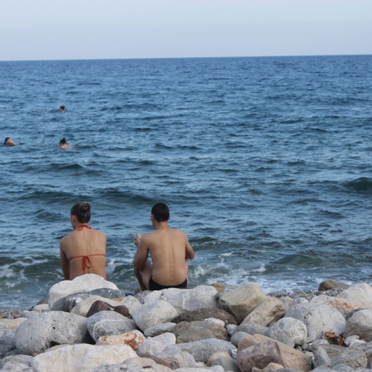 После выгрузки рюкзаков пошли на море искупнуться. Сначала к морю, затем в кусты переодеваться. На берег вернулись все, но половина с синяками, порезами, ушибами. Берег каменистый, скользкий, с острыми ракушками.
