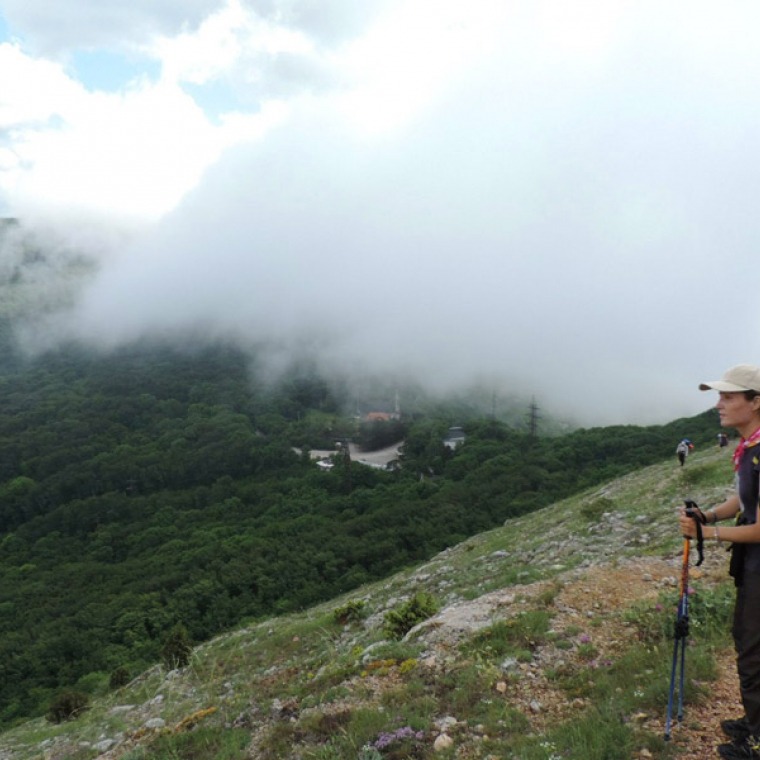 Новый день: Казалось тучи снова стали сгущаться над нашими головами, но мы своими улыбками, йогой и позитивным настроем не дали им разгуляться, а может, просто оставили их позади, потому что наш путь пролегал вверх через Байдарские ворота к горе Челеби. У её подножия расположилась смотровая площадка, с которой было видно бескрайние морские просторы и Форосскую церковь. Вот и подъем, местами вертикальный, кому-то пришлось справляться со своим страхом высоты и выйти победителем из него. Туман, как огромный дракон, вновь стал выползать из своего укрытия и заполнять собой пространство внизу.