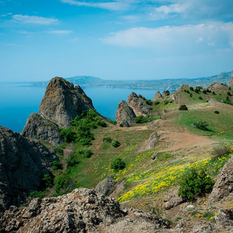 Спустя час ходьбы мы выйдем в поселок Щебетовка, зайдём в местный магазин, закупим провиант и дальше будем двигаться в сторону моря по туристической тропе. Через некоторое время мы выйдем на смотровую площадку, откуда открывается вид на прекраснейший горно-вулканический массив Кара-Даг. Это уникальное место образовалось около 150 миллионов лет тому назад в процессе среднеюрского вулканизма. Береговые скалы Кара-Дага прекрасны! Здесь находятся знаменитые Золотые Ворота, которые так любят изображать на картинах художники.