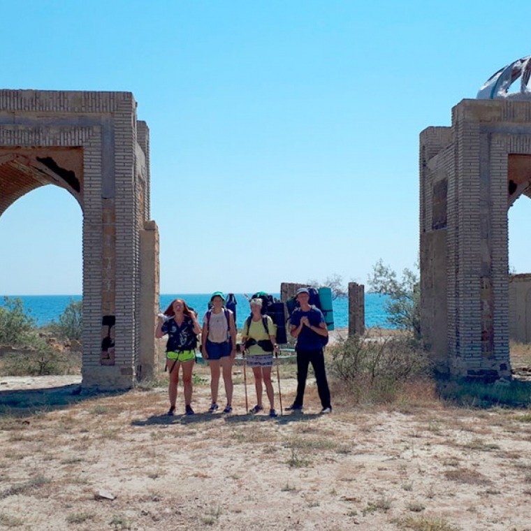 После осмотра пещеры мы пообедаем, а затем наберём побольше родниковой воды и траверсом вдоль Кара-Дага отправимся к морю. Красивый песочный пляж и прозрачная вода многих не оставит равнодушными, и, как показывает практика, всегда есть желающие окунуться в морскую гладь, ведь вода в это время уже очень тёплая. Мы пройдём вдоль красивых "шоколадных" гор, изящно вымытых водой. Довольно скоро мы дойдём в бухту Чалка, находящуюся около посёлка Прибрежное. По пути мы пройдём через "Киногородок" – весьма примечательное место. Когда-то тут готовились снимать фильм "Живая рыба", но сьёмки не состоялись, а декорации остались. Это начало большого плато мыса Меганом.