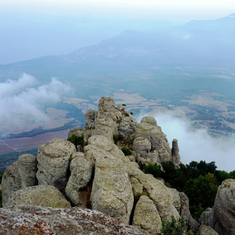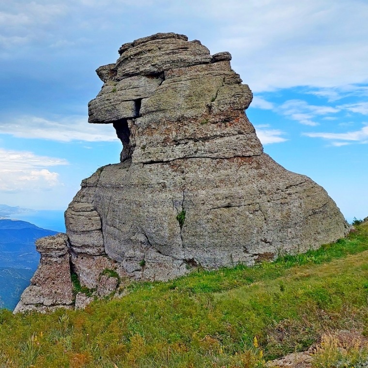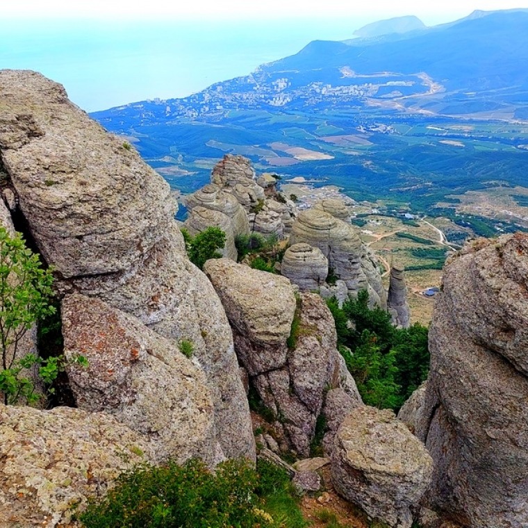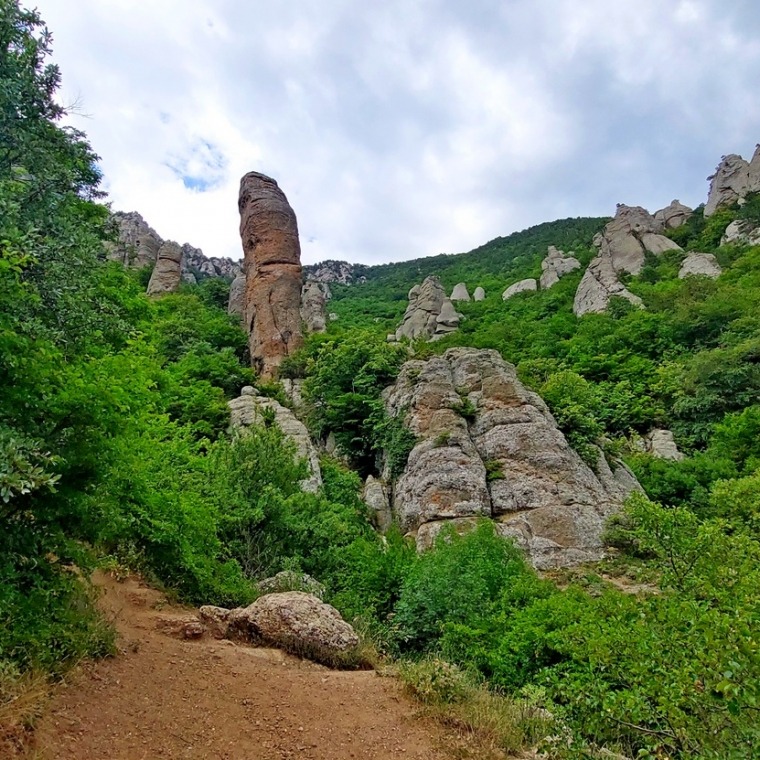 Тропа плавно ведёт нас вверх по разлому ущелья, красивые изваяния встают то справа, то слева. Мы поднимаемся к фигуре, которую туристы называют «Спящий монах». Отсюда открывается чудесный вид на Долину Привидений. Тропа уводит группу выше, и вот мы уже на смотровой площадке – большой зелёной поляне. С неё отлично видно морское побережье и Алушту, горный массив Чатыр-Даг и яйлу Бабуган, вдалеке виднеется село Изобильное и блестящая гладь водохранилища рядом с ним. Можно часами сидеть и смотреть на эту красоту! Передохнув и вдоволь налюбовавшись видами, мы отправимся дальше – вверх по тропе, на Южную Демерджи.