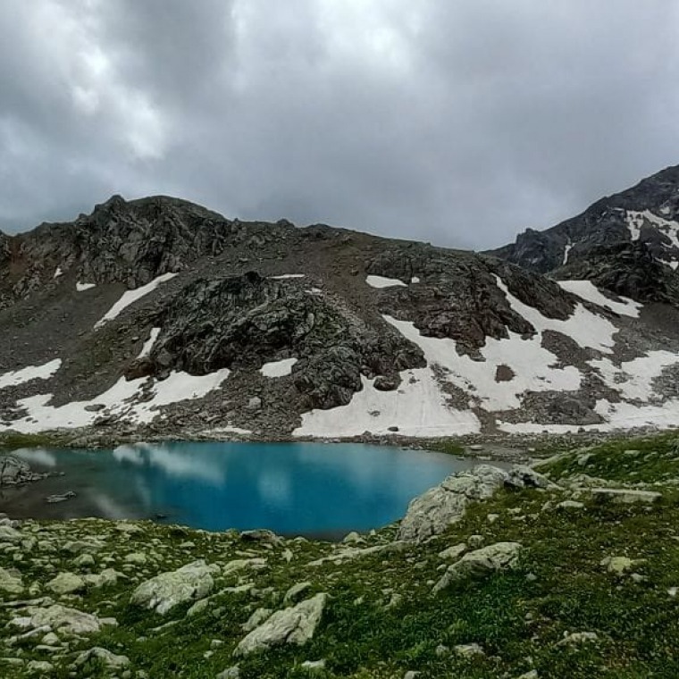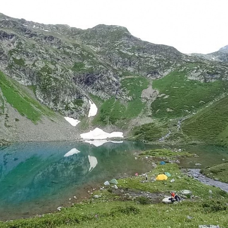 Крутой, но недлинный подъем, откроет перед нами волшебный пейзаж. Сначала около трех километров идём вдоль ручья Ак-Айры до первого горного прозрачного озера Айматлы Джагалы. Осыпи и скалы, спускающиеся к воде, а также небольшой язычок ледника создают волшебную атмосферу. На этой высоте уже нет деревьев, зато между камней пробивается ковровыми полянками рододендрон. С прекрасными видами на горы и озеро расположим свой лагерь, пообедаем, после обеда отдых, а для тех кто не устал прогулка по месту.