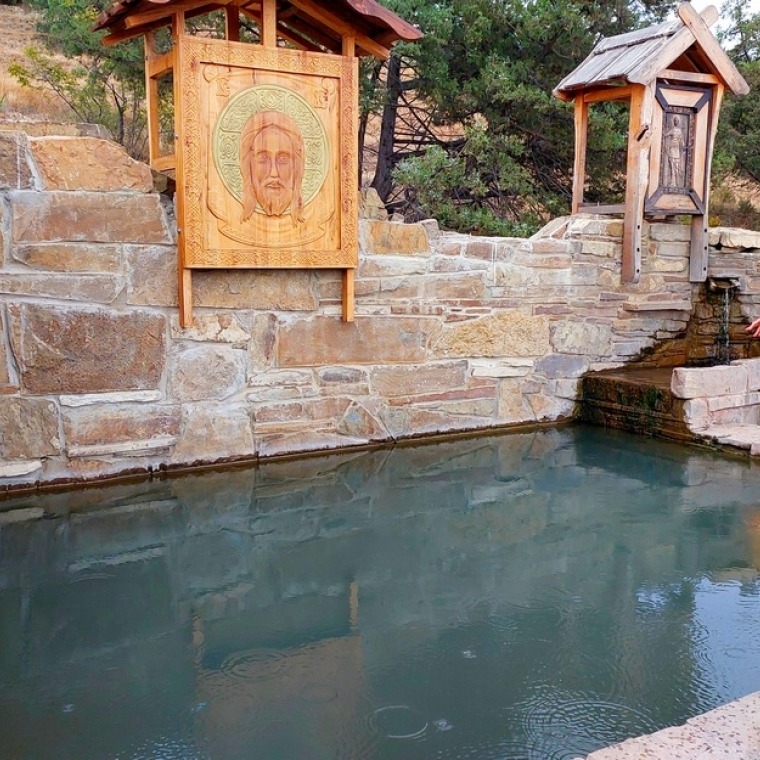 Под верхней скалой горы Ай-Георгий находится источник, вода из которого считается целебной. Его посещают многие монахи и паломники. А недалеко от родника находится купель с освящённой водой, в которой можно искупаться, чтобы очиститься и наполниться энергией.