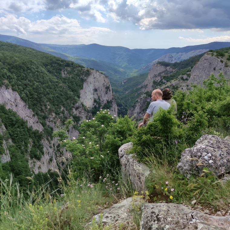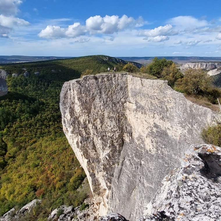 Поднявшись по тропе, пролегающей посреди леса, мы выйдем к группе смотровых площадок, откуда открываются чудесные виды на Большой каньон Крыма, очаровывающие с первого взгляда! Простор вокруг умопомрачительный! Вдоволь погуляв на этих смотровых площадках и побывав в небольшой пещере под названием Коровий грот, мы двинемся вниз, обратно к Голубому озеру.