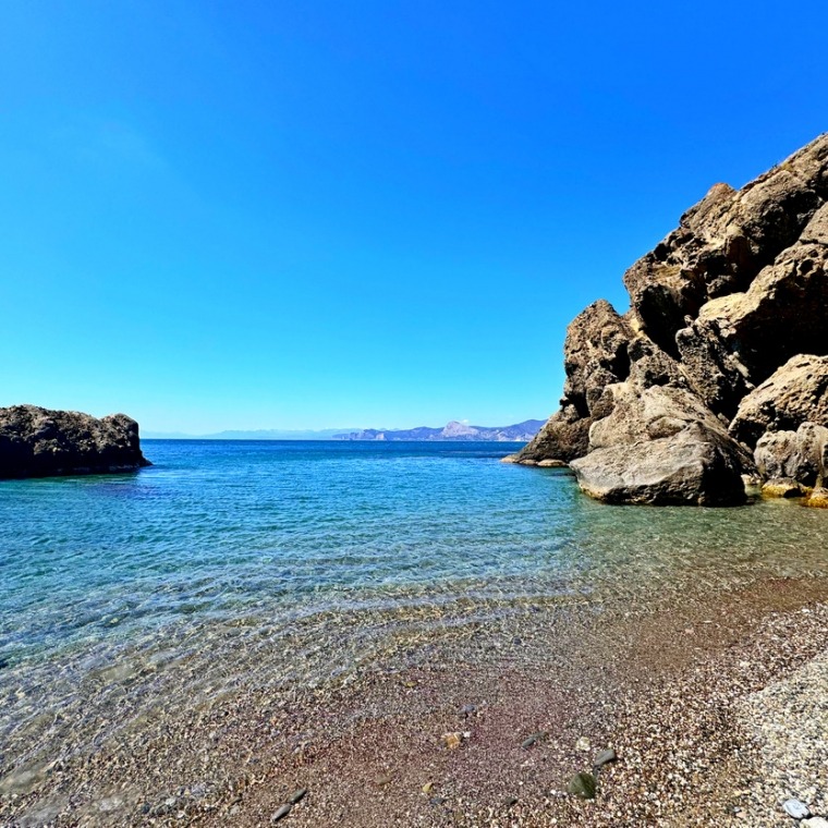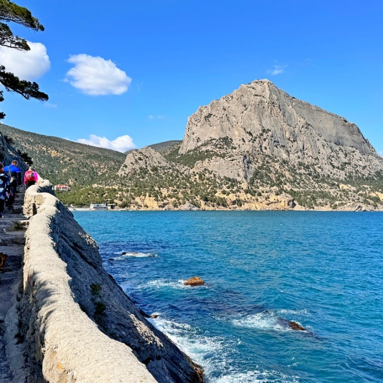 Далее мы отправимся вниз и затем траверсом вдоль Эчки-Дага, выйдем к заброшенному киногородку. Это место – комплексный памятник природы местного значения. Песчано-галечный пляж тянется в обе стороны на километры, во многих местах подпираемый живописными скалами шоколадного цвета, покрытыми зеленью и цветами. Двигаясь по тропе вдоль моря, группа дойдёт до посёлка Прибрежное, откуда и уедет на заказном автобусе обратно в Судак.